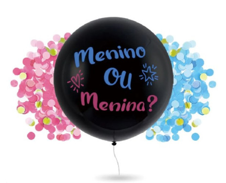 Balão com confettis em cor de rosa e azul. Com as inscrição "Menino ou Menina?"