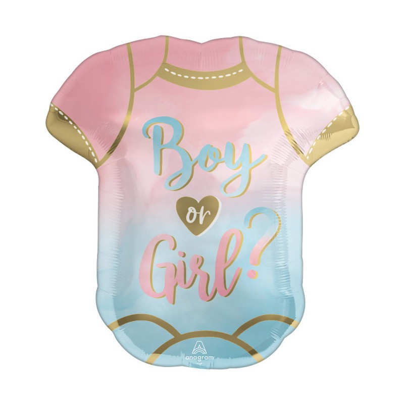 Balão foil com a forma de body em cor de rosa e azul com a inscrição "Boy or Girl?" decorar um baby shower, chá de bebé.
