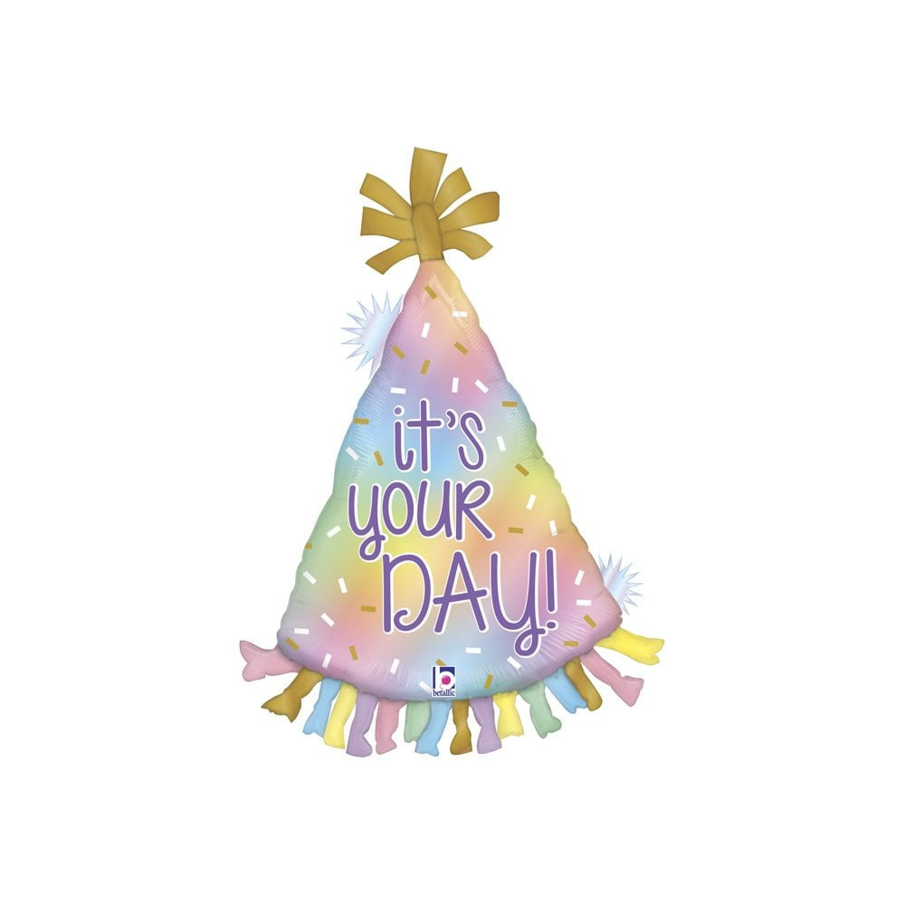 Balão foil supershape com a forma de chapéu cone de festa com a inscrição "It's your day" em opal. Ideal para decorar festas de aniversário.