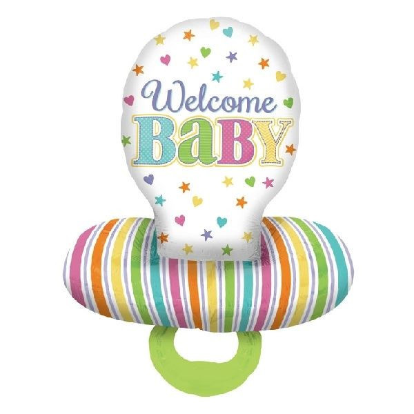 Balão foil de tamanho grande com a forma de chucha, com a inscrição "Welcome Baby" para a decoração de chá de bebé, baby shower.