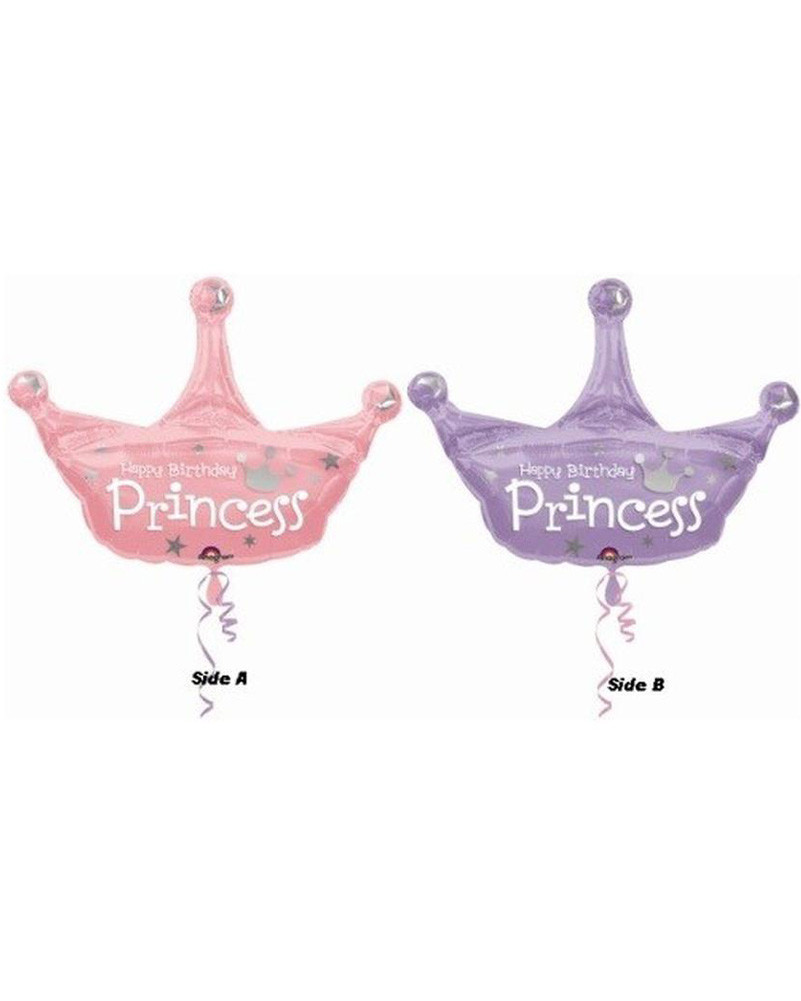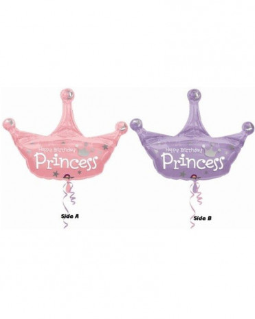 Balão foil supershape com forma de coroa ideal para festas de aniversário dignas de uma princesa, com a inscrição "Happy Birthday Princess". Com dupla face, um lado em lilás e outro em rosa.