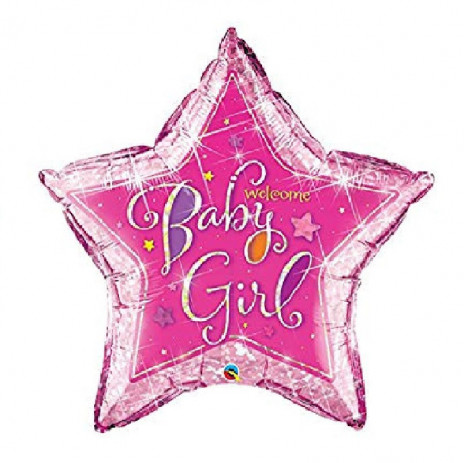 Belíssimo balão foil Supershape em forma de estrela holográfica com a descrição Welcome Baby Girl.