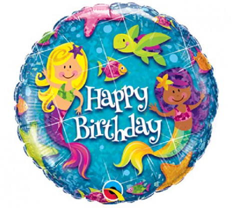 Belíssimo balão foil Supershape redondo Happy Birthday com duas Sereias.