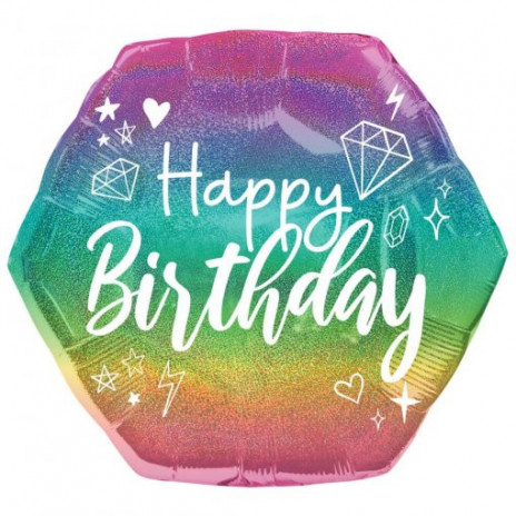 Balão foil com a forma de hexágono, com a inscrição "Happy Birthday" para decoração da sua festa de aniversário, com brilhos e holográfico.