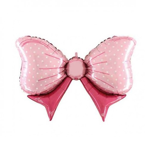 Balão foil supershape em forma de laço na cor rosa bebé com bolinhas brancas. Para chá de bebé ou qualquer outro evento.