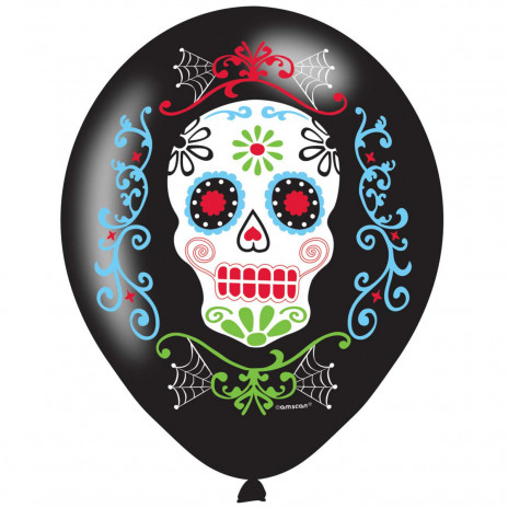 Pack de 6 balões látex de cor preta com 11"/27cm, com desenho de caveira
