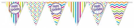 Bandeira de tamanho grande para festas de aniversário, com listas e bolinhas coloridas.