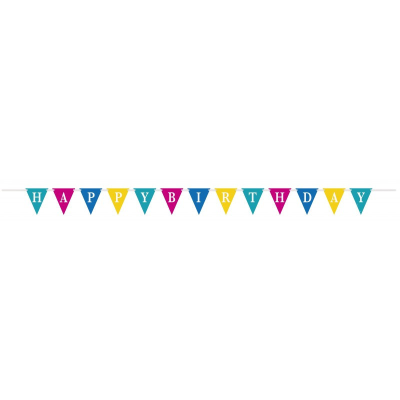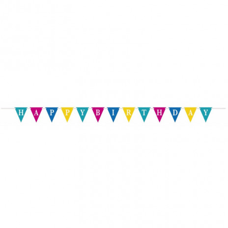 Banner com cores coloridas para decoração de qualquer festa de aniversário com a inscrição "Happy Birthday". Contém 13 bandeirolas, cada uma com cerca de 19cms.