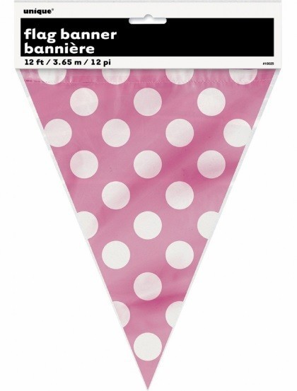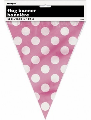 Bandeirola formato cone plastificado de cor rosa com bolinhas brancas, para decoração da tua festa de anos.