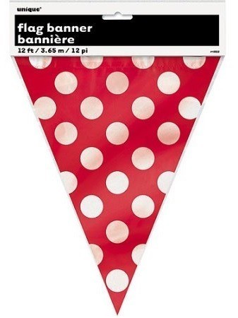 Bandeirola formato cone plastificado de cor vermelha com bolinhas brancas, para decoração da tua festa de anos.