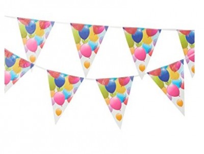 Bandeirolas plásticas com ilustrações Ballons Party para a decoração de festas de anos.Largura total: 3 metros.