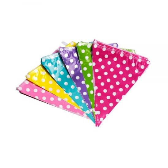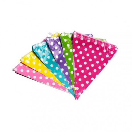 Bandeiras em formato cone plastificado com bolas brancas, para decoração de qualquer festa de aniversário e evento. Disponível em rosa, amarelo, azul, roxo, verde e fúscia.
