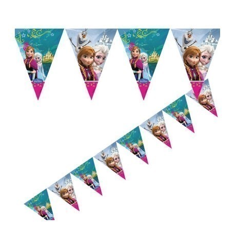 Decora a tua festa de aniversário com esta grinalda com bandeiras triangulares (17cm lag. x 25cm alt.) nas cores azul e rosa com estampagem das Princesas Elsa e Anna do filme Disney Frozen.