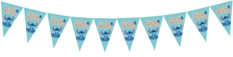 Bandeiras de formato triangular decorativas do Stitch da Disney para decorar a tua festa de aniversário com o mesmo tema.