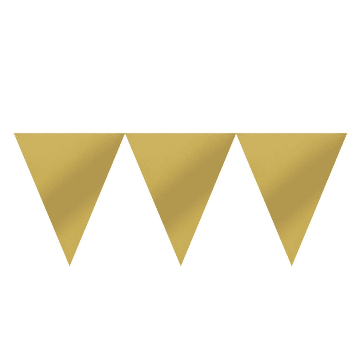 Bandeirola triangular de cor dourada para decoração da sua festa de anos. Inclui 24 bandeiras e cordão.