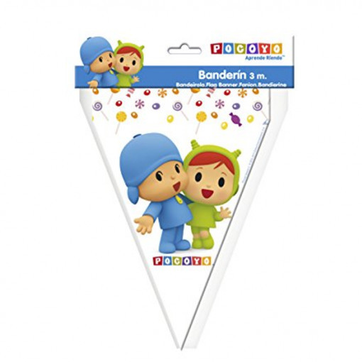 Bandeiras de formato triangular decorativas em papel do Pocoyo para decorar a tua festa de aniversário com o mesmo tema.