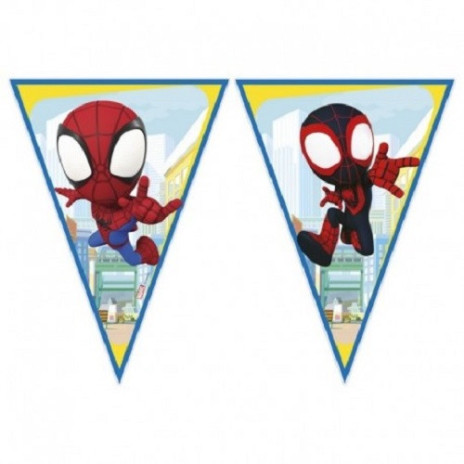 Bandeiras de formato triangular decorativas em papel do Spidey da Marvel para decorar a tua festa de aniversário com o mesmo tema.