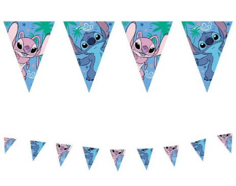 Bandeiras de formato triangular decorativas em papel de do Stitch da Disney para decorar a tua festa de aniversário com o mesmo tema.