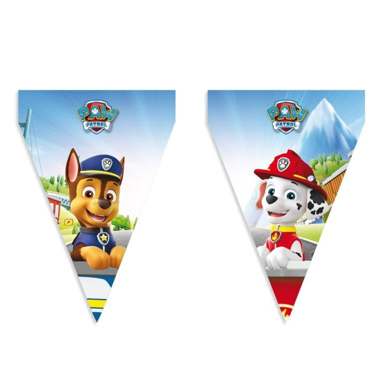 Bandeiras de formato triangular decorativas da Paw Patrol para decorar a tua festa de aniversário com o mesmo tema.