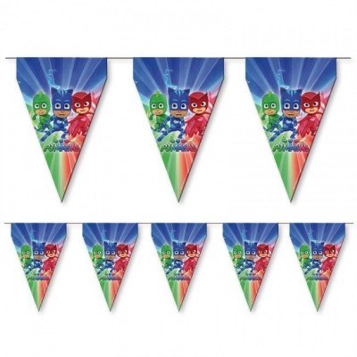 Bandeirolas plásticas com ilustrações dos PJ Masks para a decoração de festas de anos.Largura total: 3 metros.