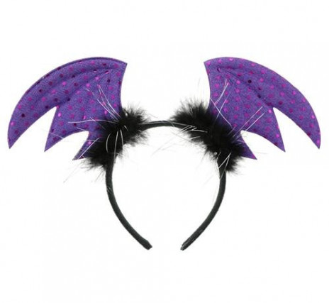 Asas de morcego violetas fixas numa bandolete com elástico preto, decoradas com lantejoulas e plumas pretas.