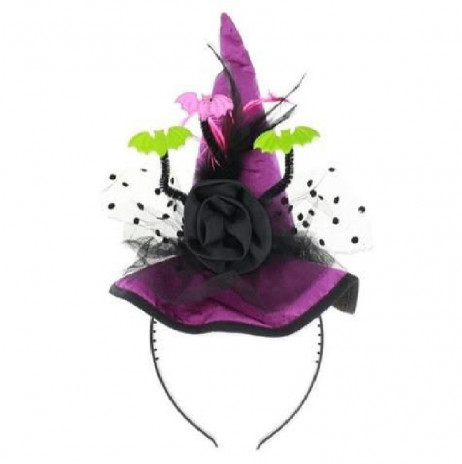 Chapéu com a adição de uma rosa negra, véu, penas, morcegos.