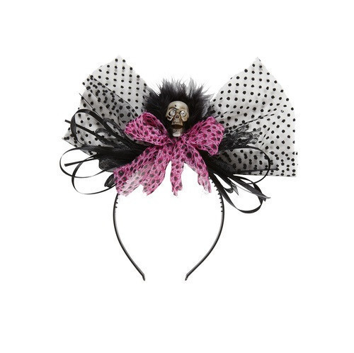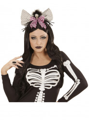 Bandolete com caveira com pormenor de laço em fúchsia para complementar o seu disfarce de halloween ou de carnaval.