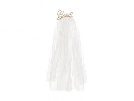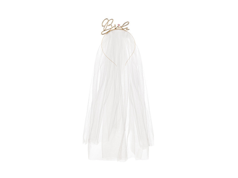 Bandolete em dourado com véu para despedidas de solteira, com a inscrição "Bride". O véu tem cerca de 50cm de comprimento.