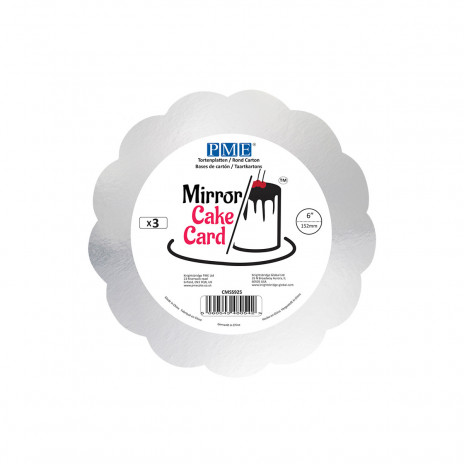 A base de bolo da PME tem as bordas em ondas e é brilhante com um efeito espelhado em prateado.