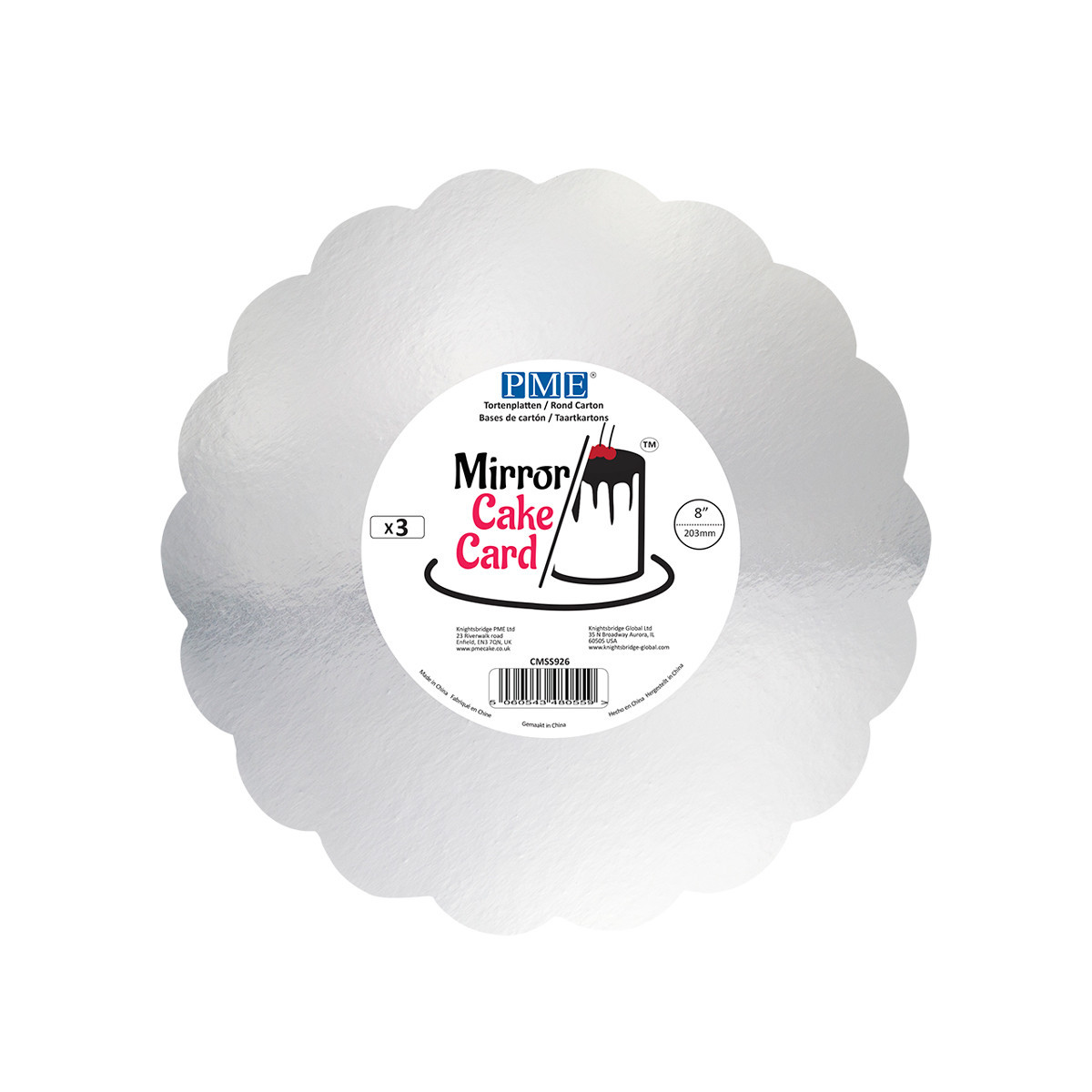 A base de bolo da PME tem as bordas em ondas e é brilhante com um efeito espelhado em prateado.