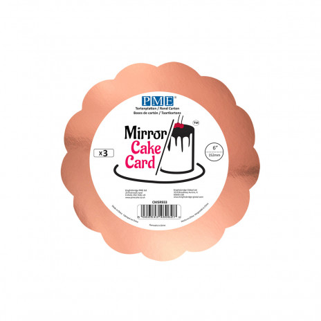 A base de bolo da PME tem as bordas em ondas e é brilhante com um efeito espelhado em rose gold.