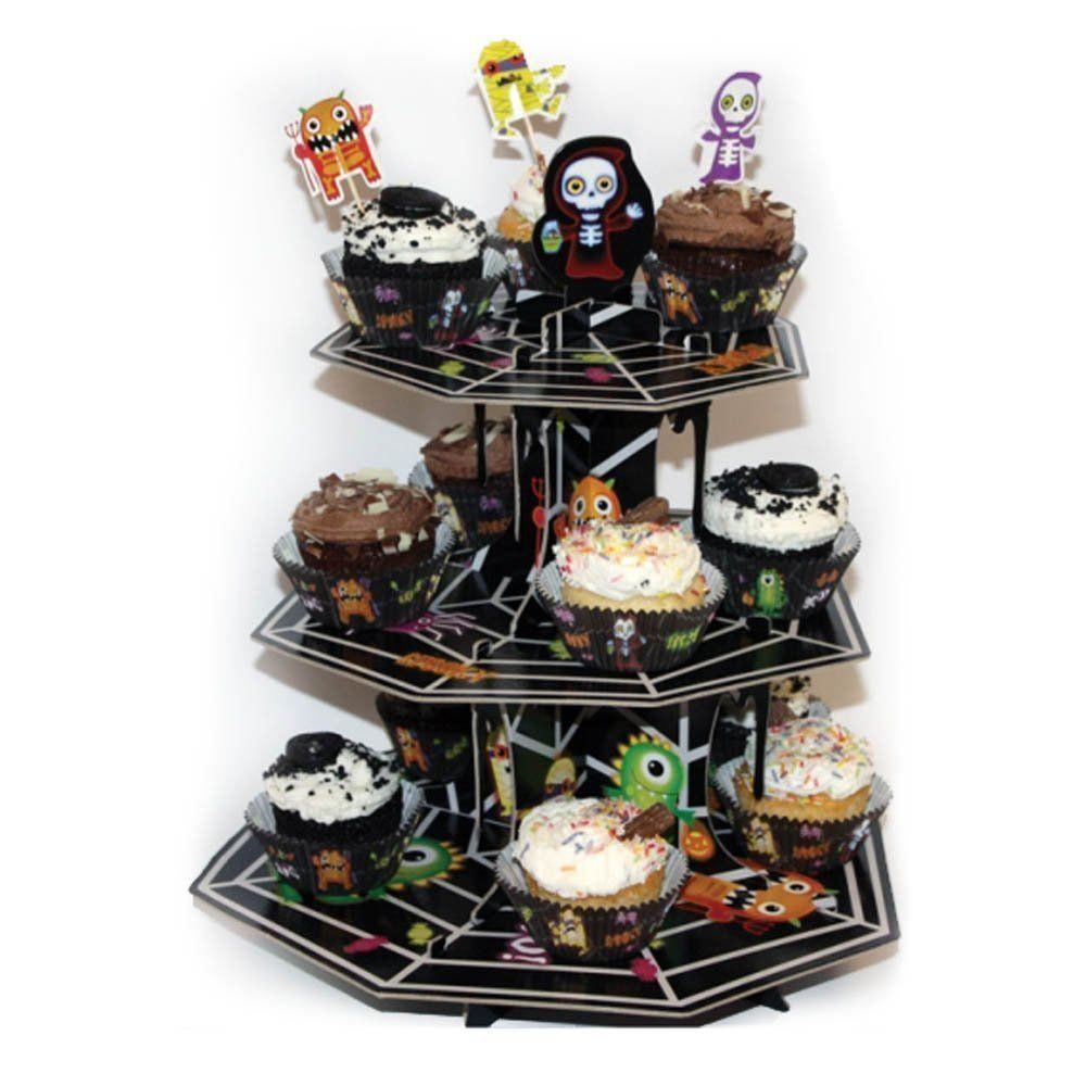 Suporte para os cupcakes numa festa de Halloween. O suporte é feito de papelão duro e possui três andares. Ideal para colocar 12 a 18 muffins de doces.