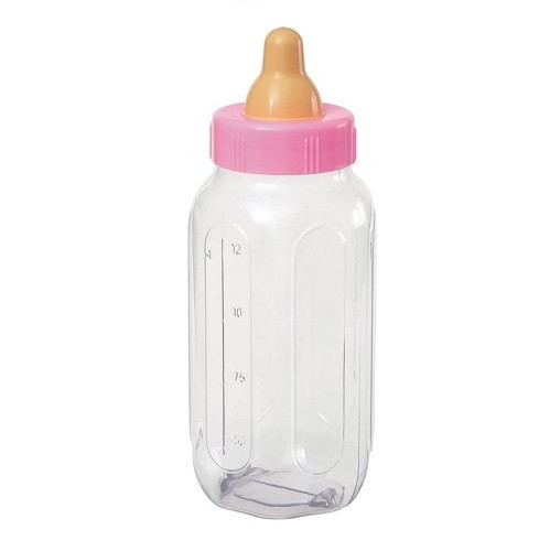 Biberon de plástico cor-de-rosa para decoração ou como mealheiro em baby showers para os convidados fazerem as suas ofertas.