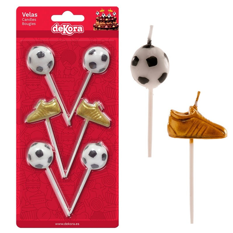 Pack contendo 6 velas alusivas ao futebol: 4 bolas de futebol e duas botas douradas de futebol