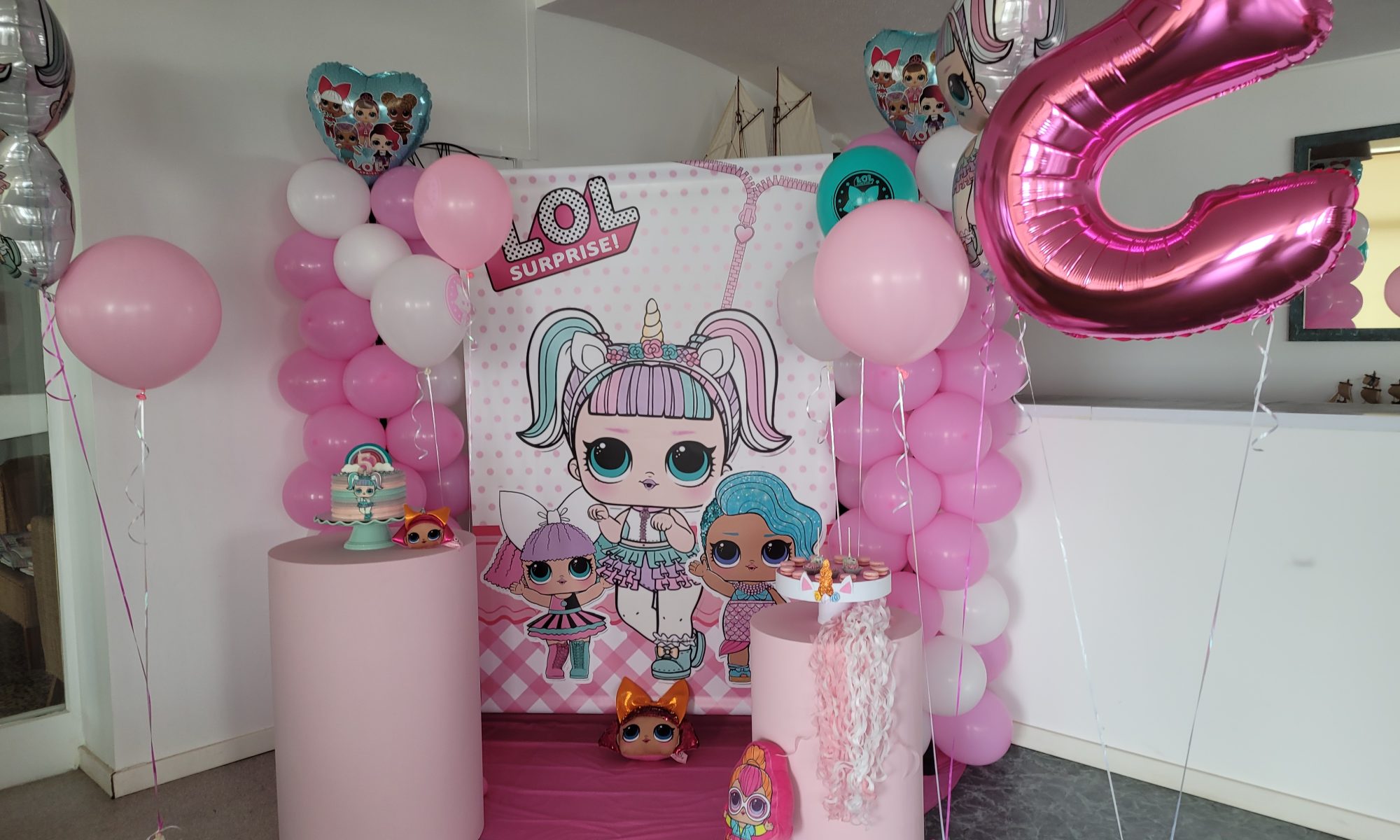 Realização de decoração de uma festa LOL unicórnio com o fornecimento do bolo e o catering doces e salgados.