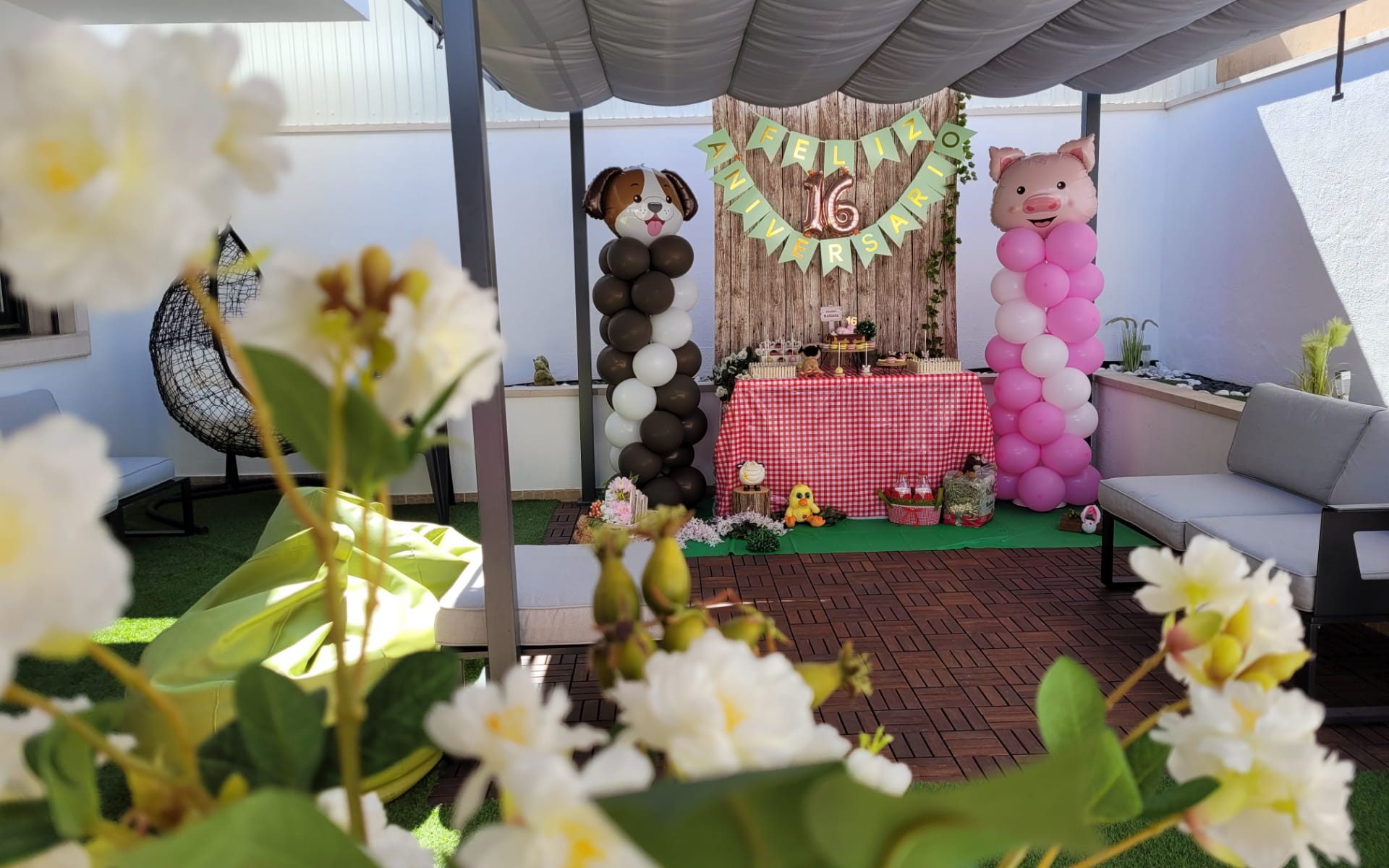 Uma festa muito completa, de uma adolescente de 16 anos, que adora animais e tem o sonho de ser medica veterinária, se possível em quintas. Fornecemos o bolo aniversário, todos os doces e salgados, além da decoração.