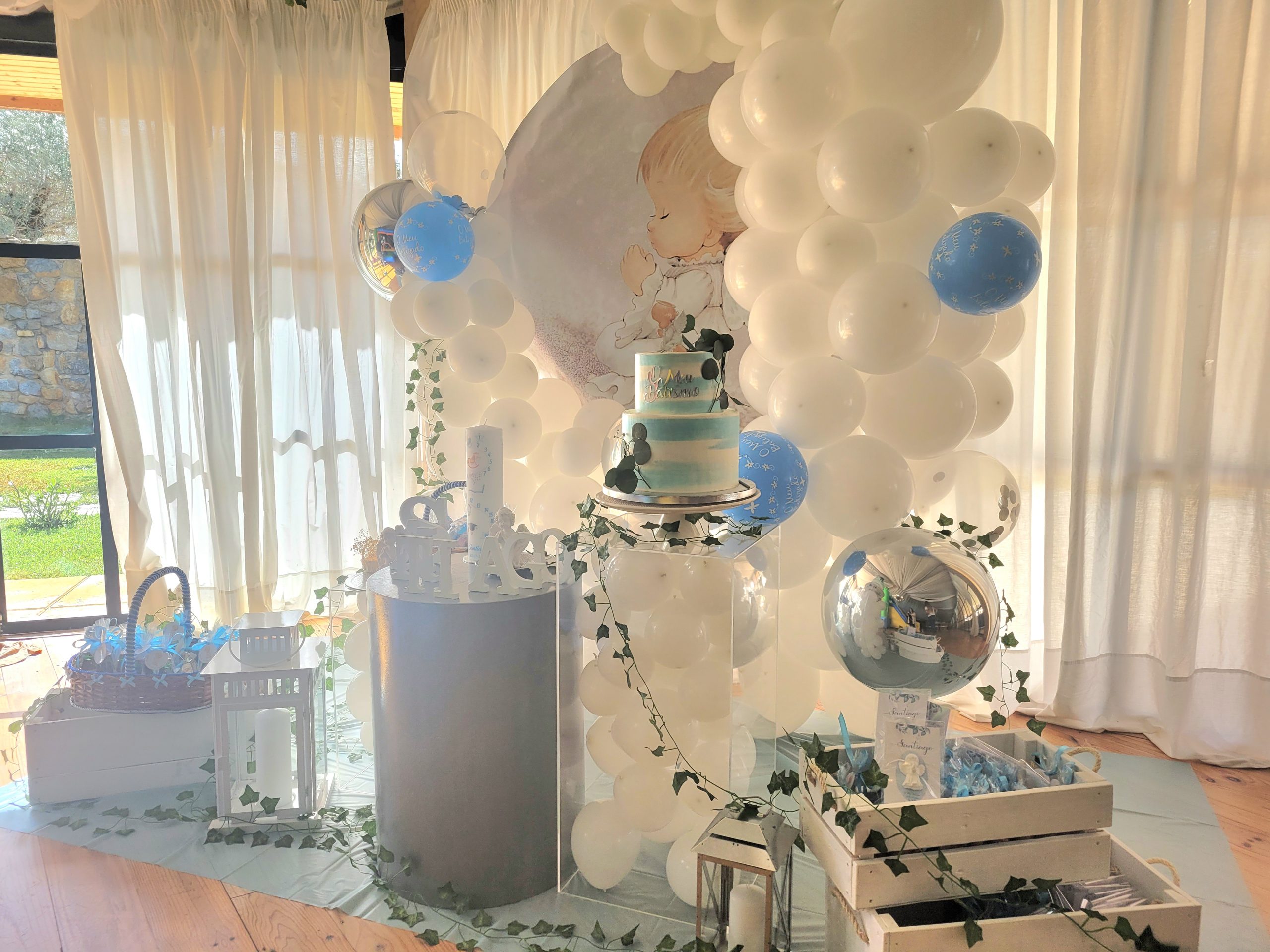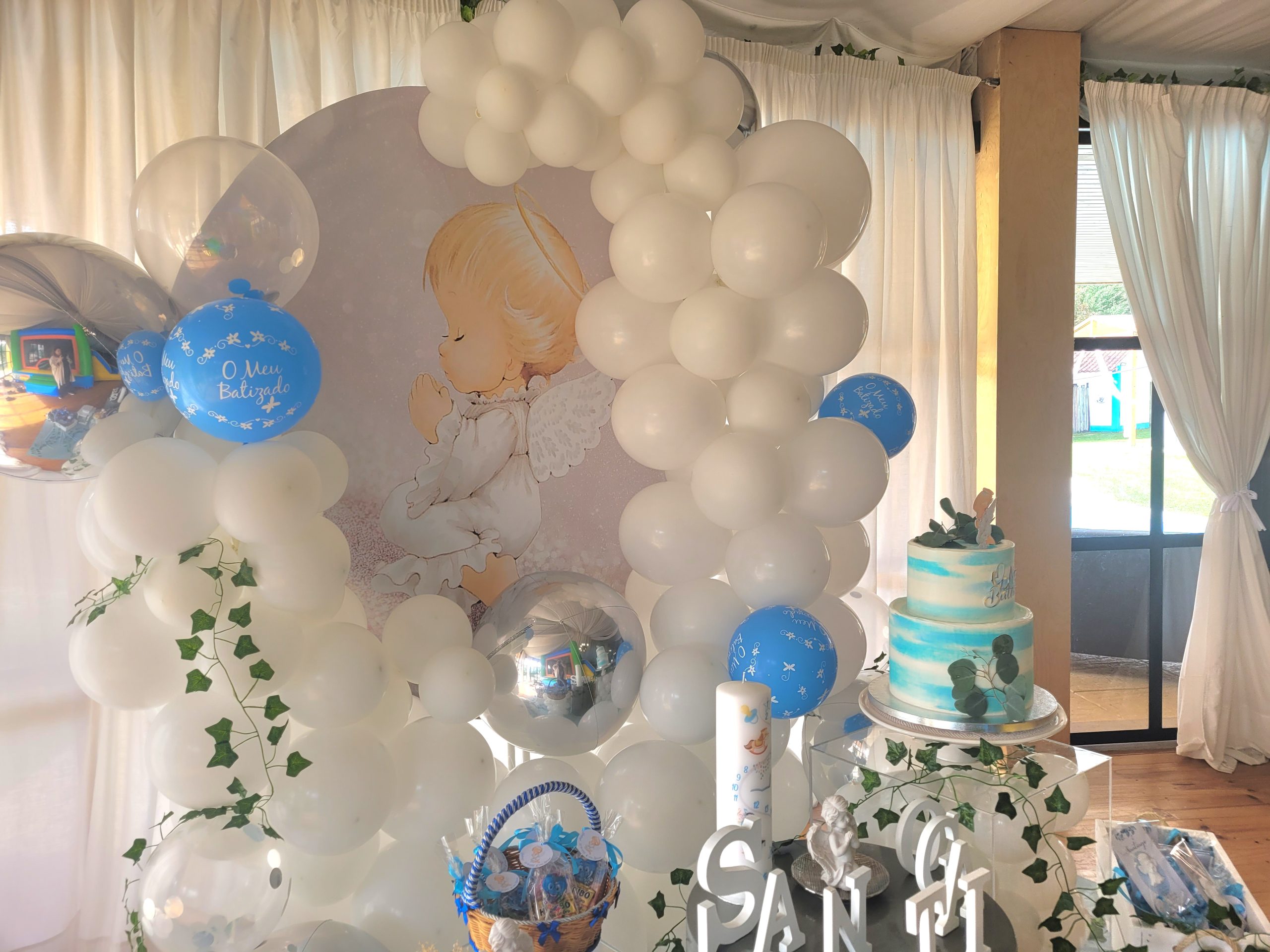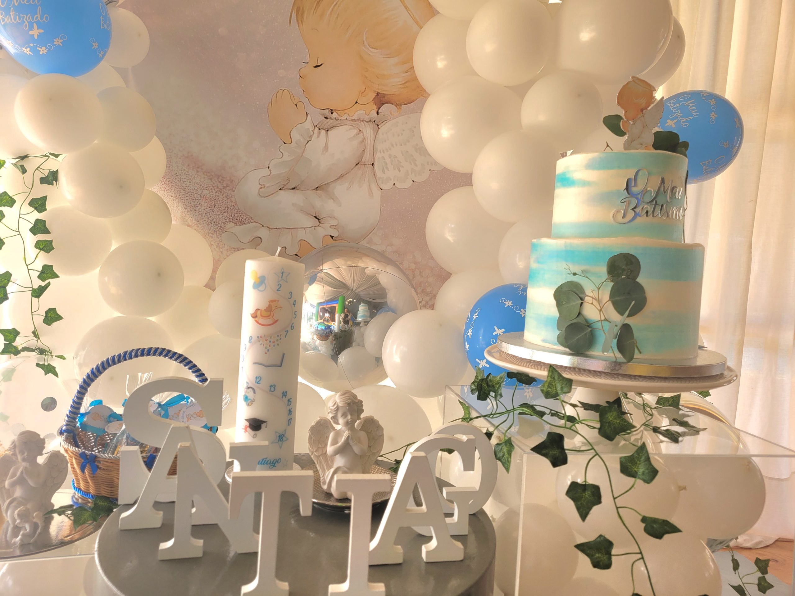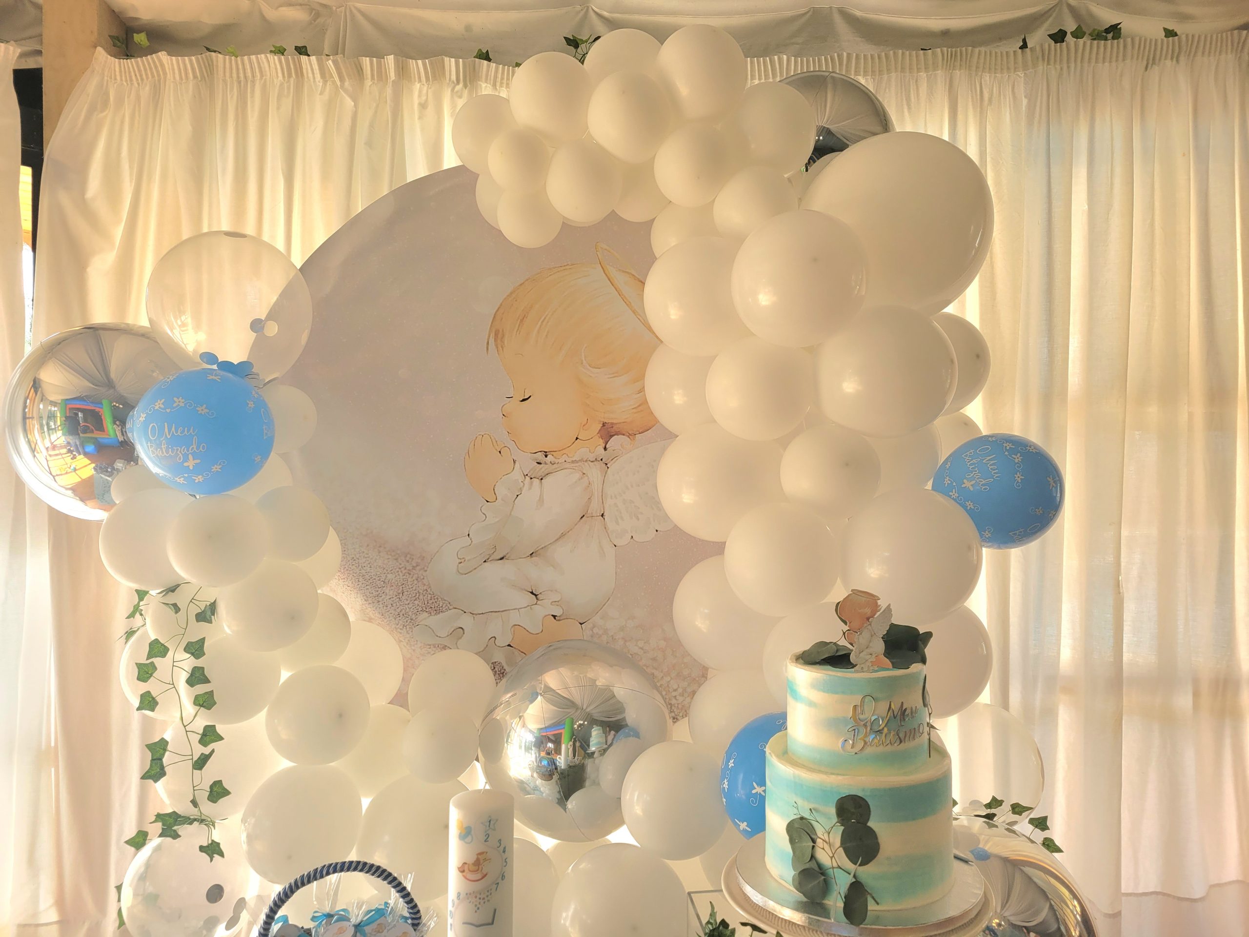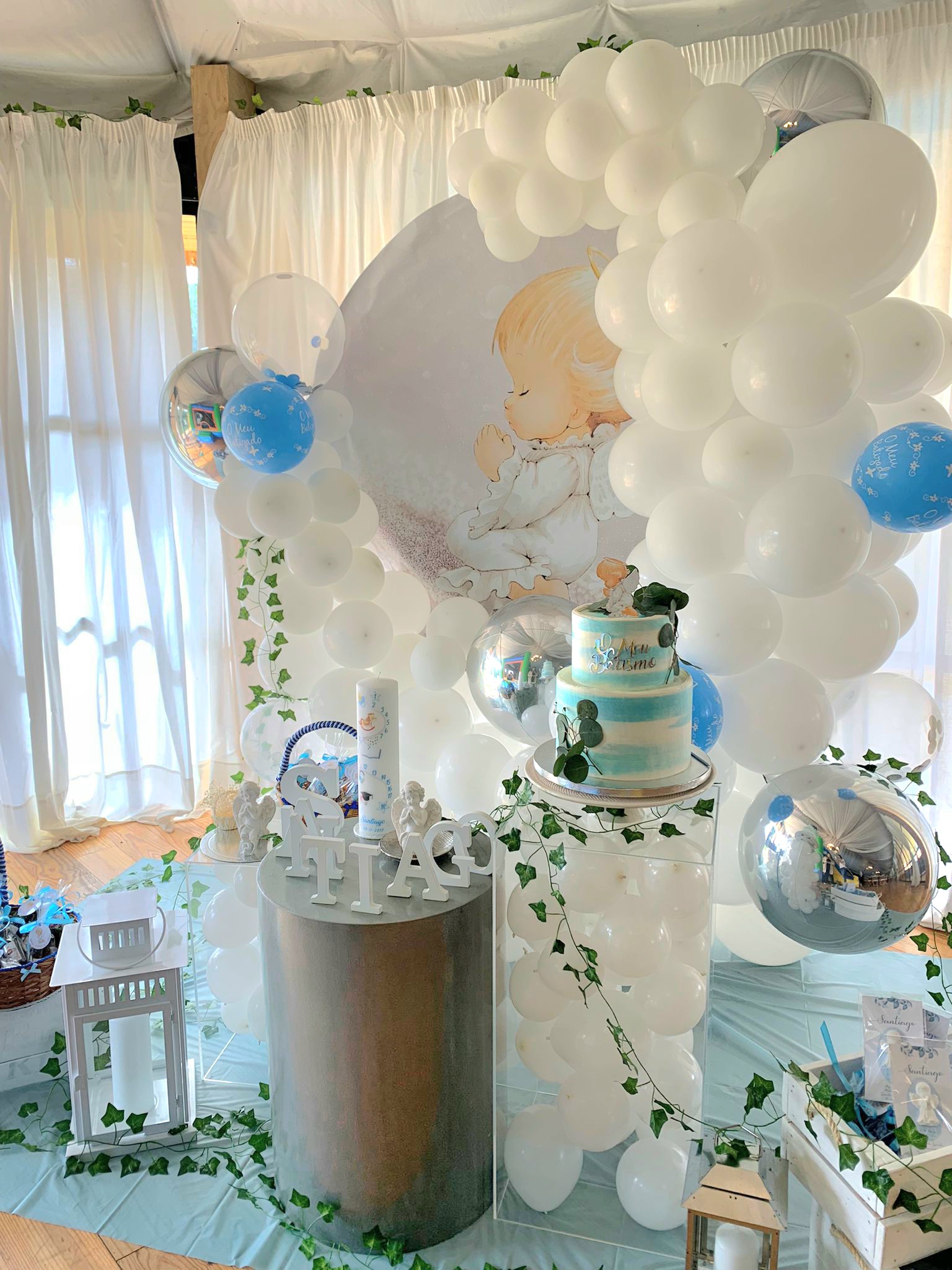Batismo de menino com diversos elementos decorativos. obrigada papás.