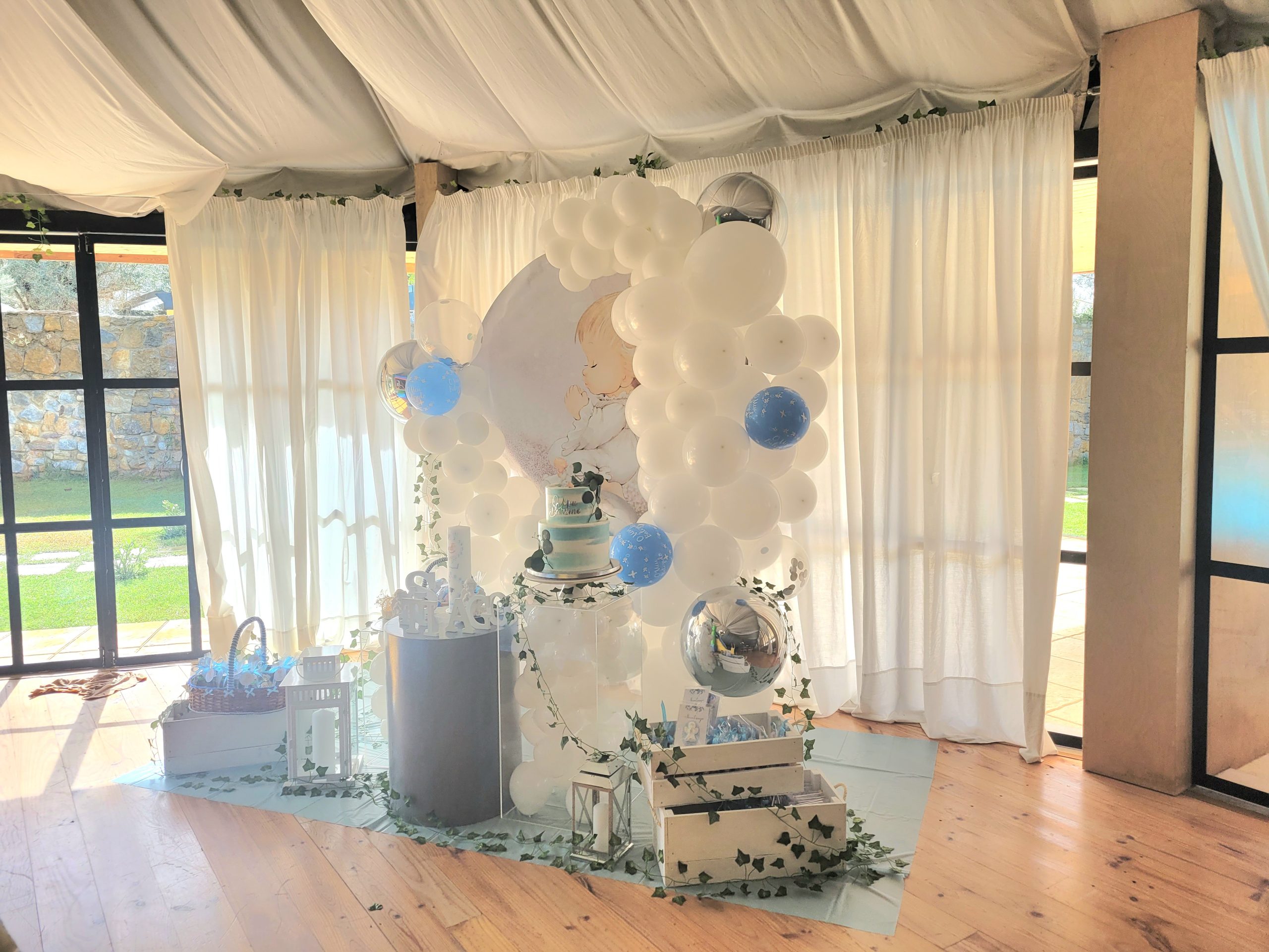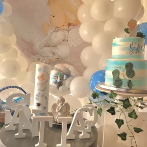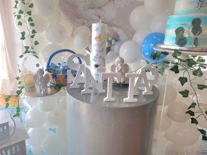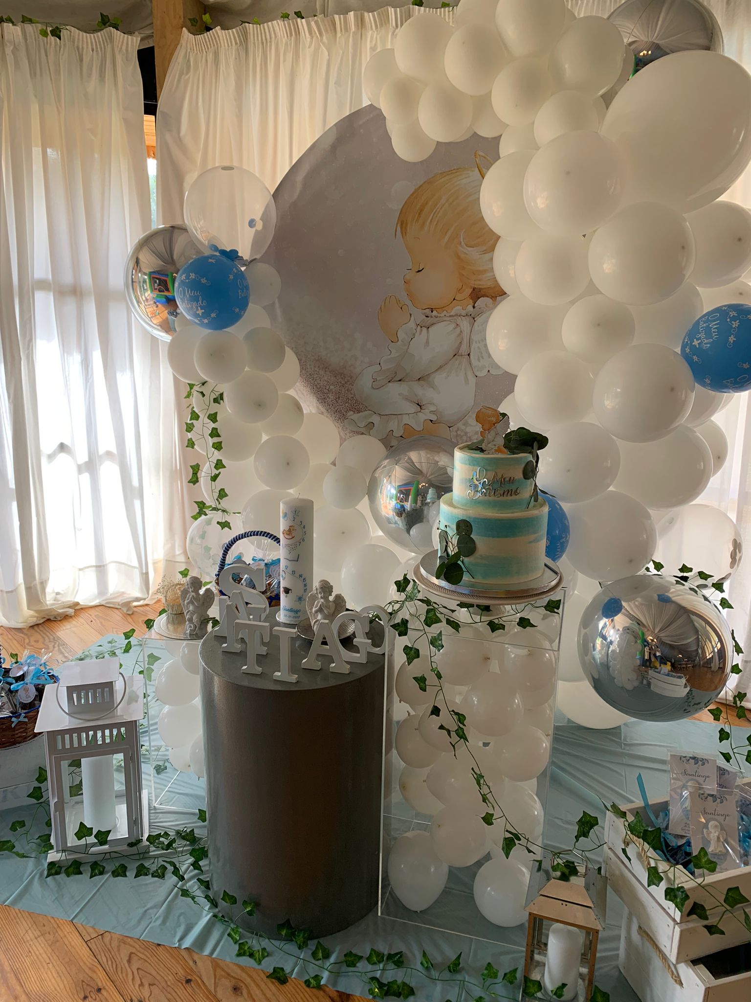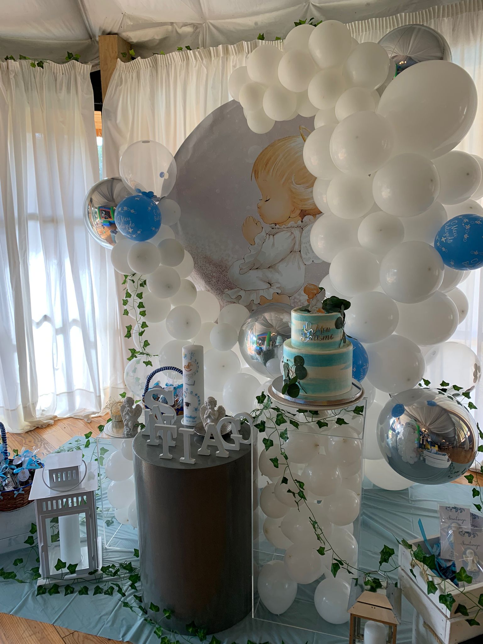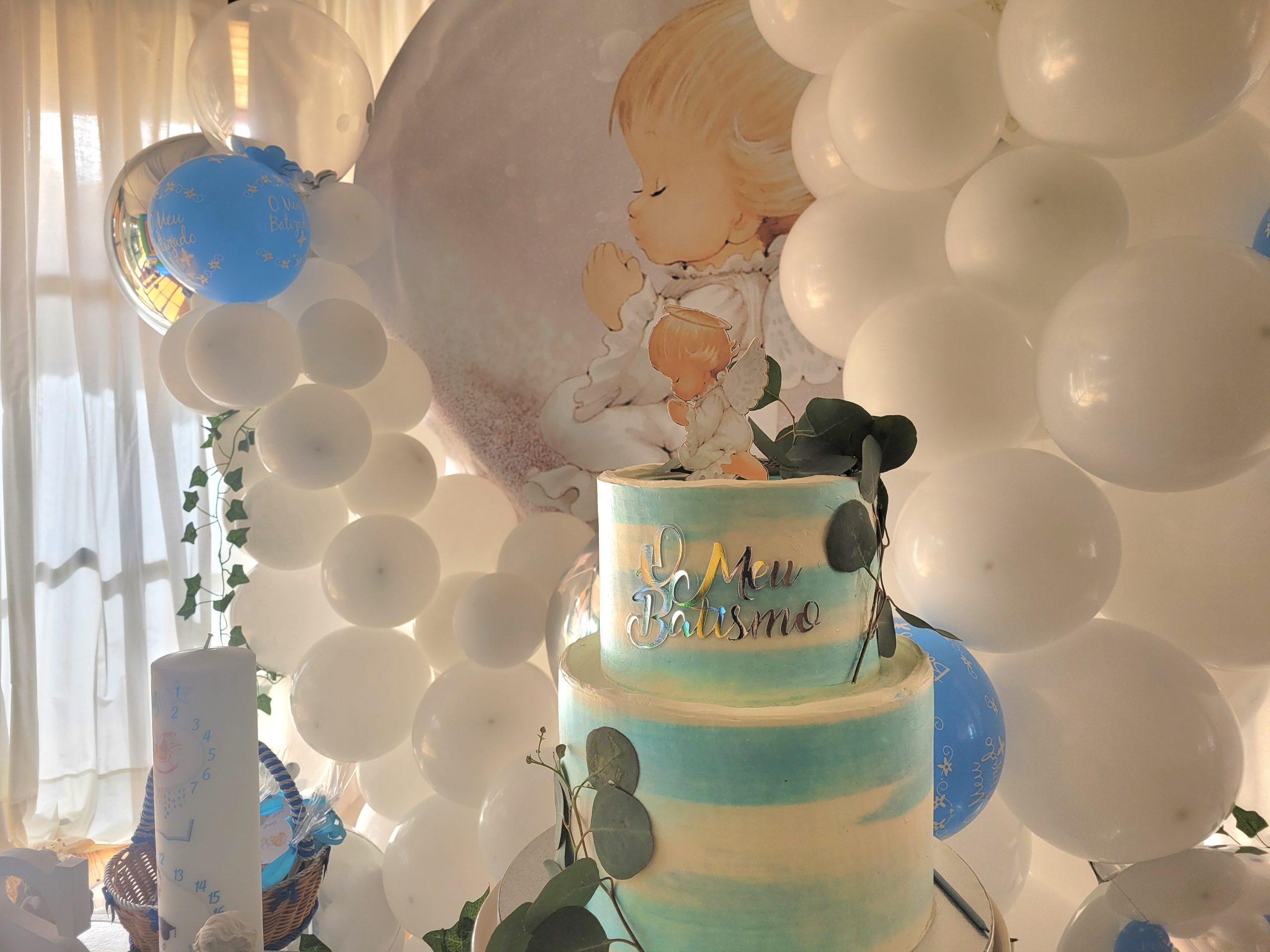 Batismo de menino com diversos elementos decorativos. obrigada papás.