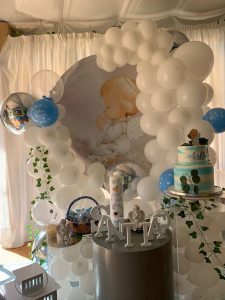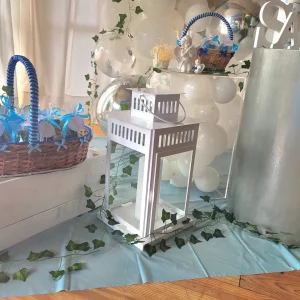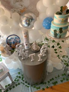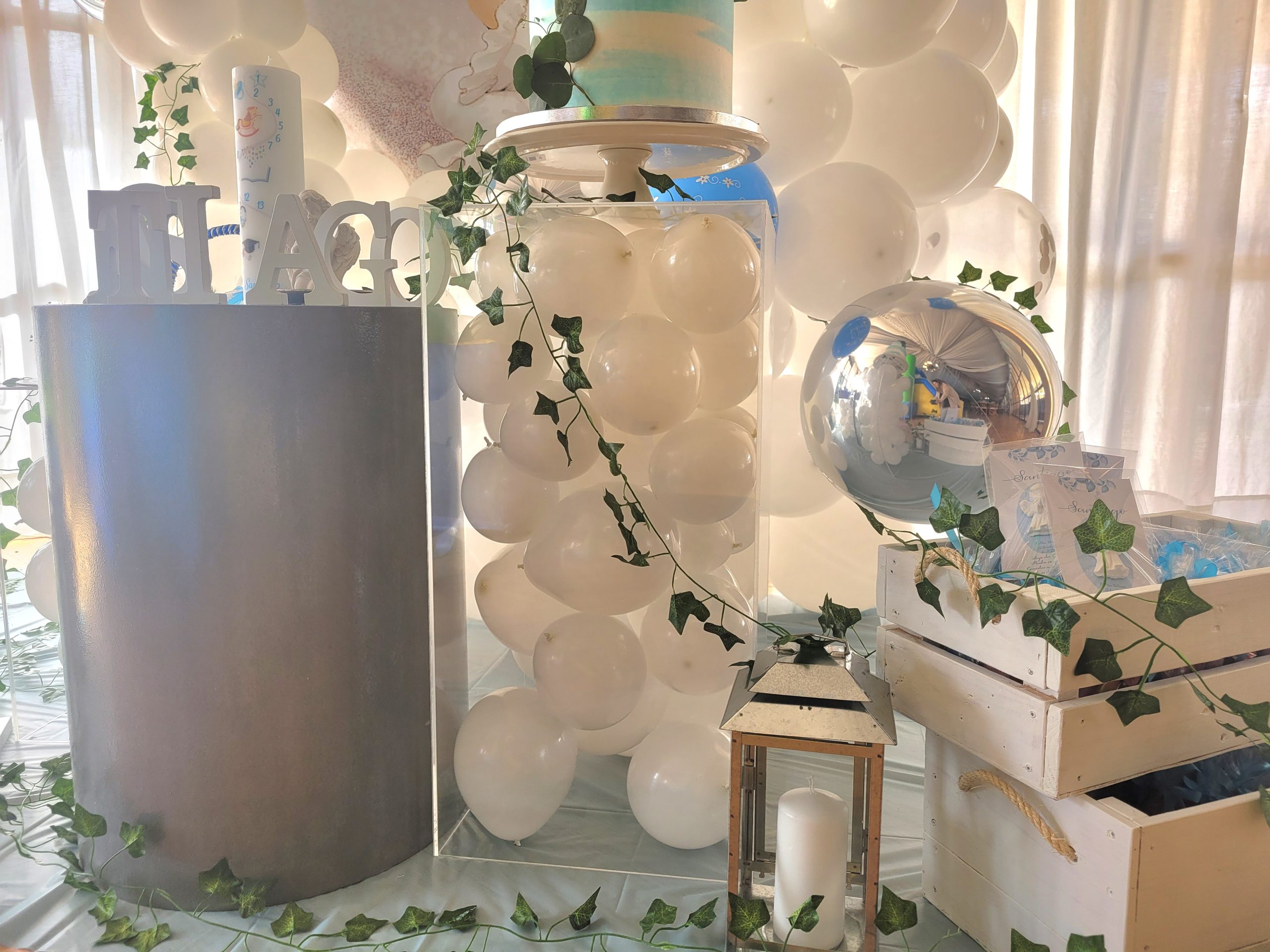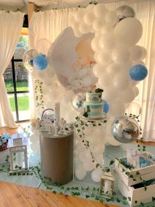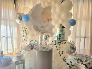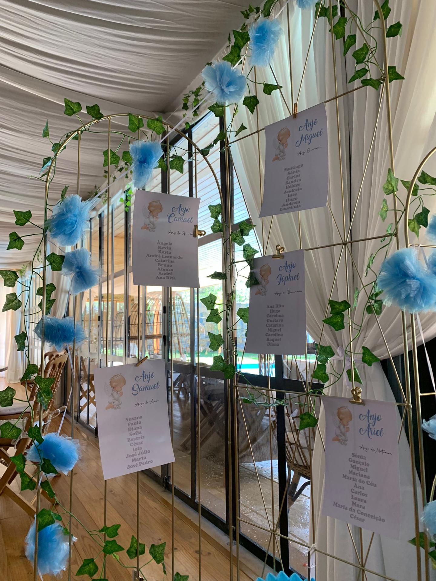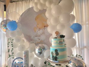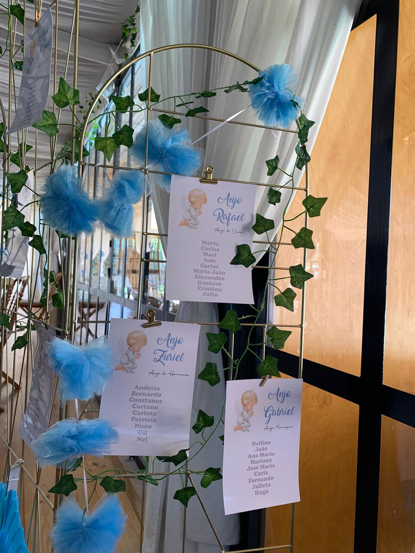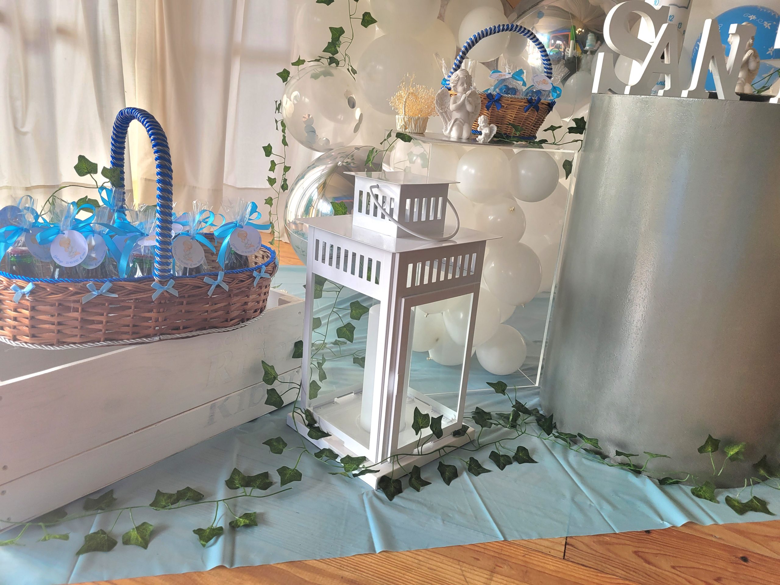 Batismo de menino com diversos elementos decorativos. obrigada papás.