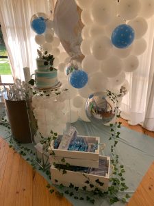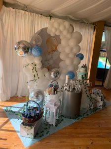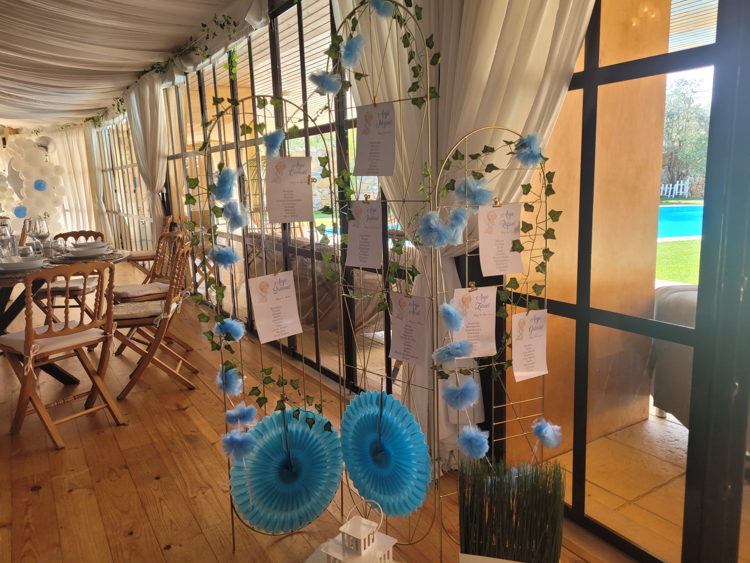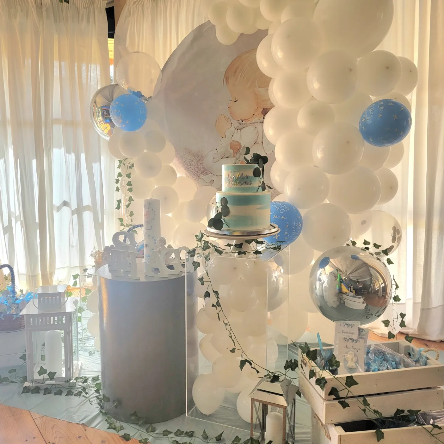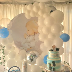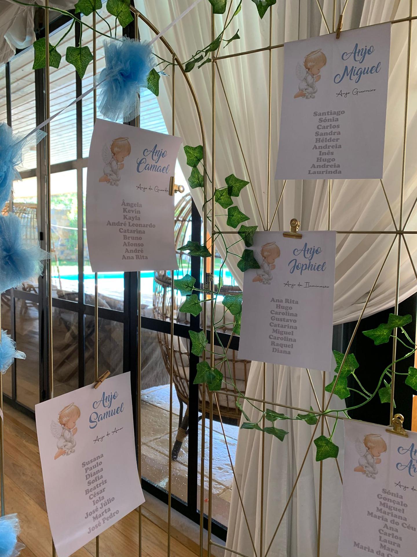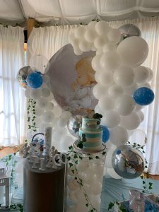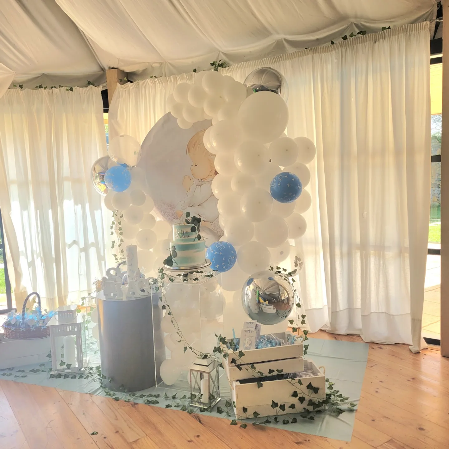 Batismo de menino com diversos elementos decorativos. obrigada papás.