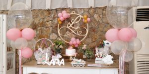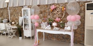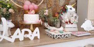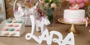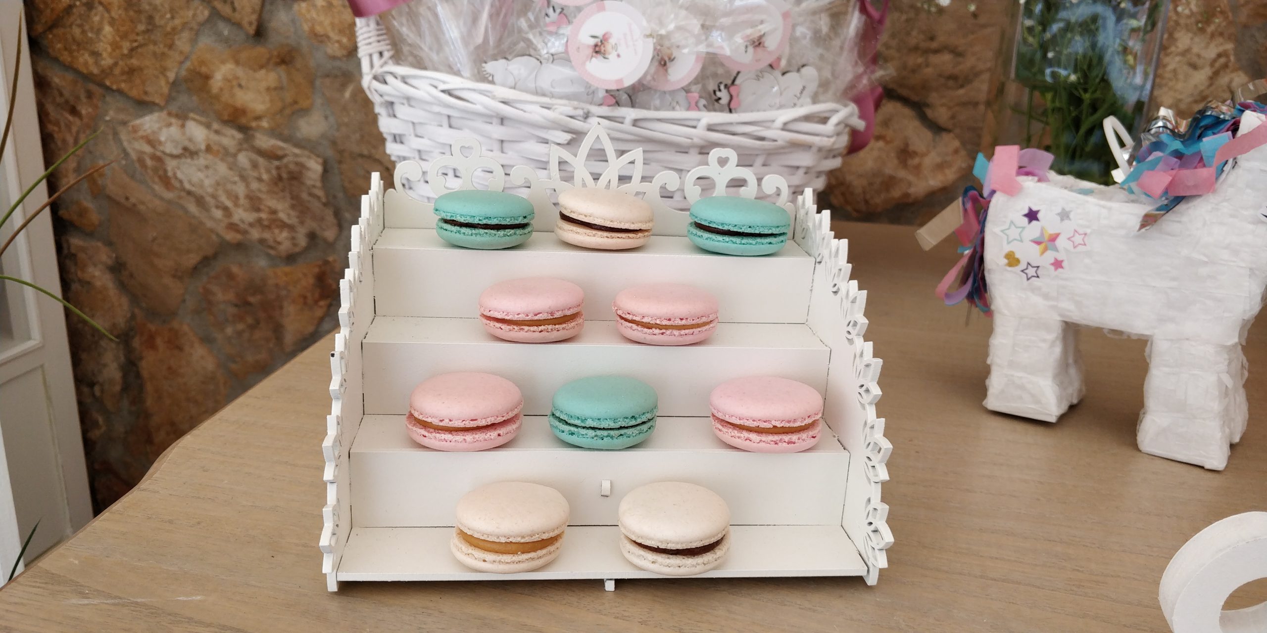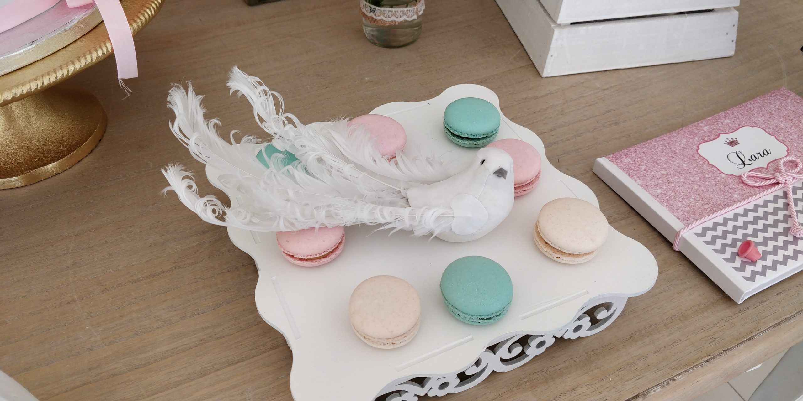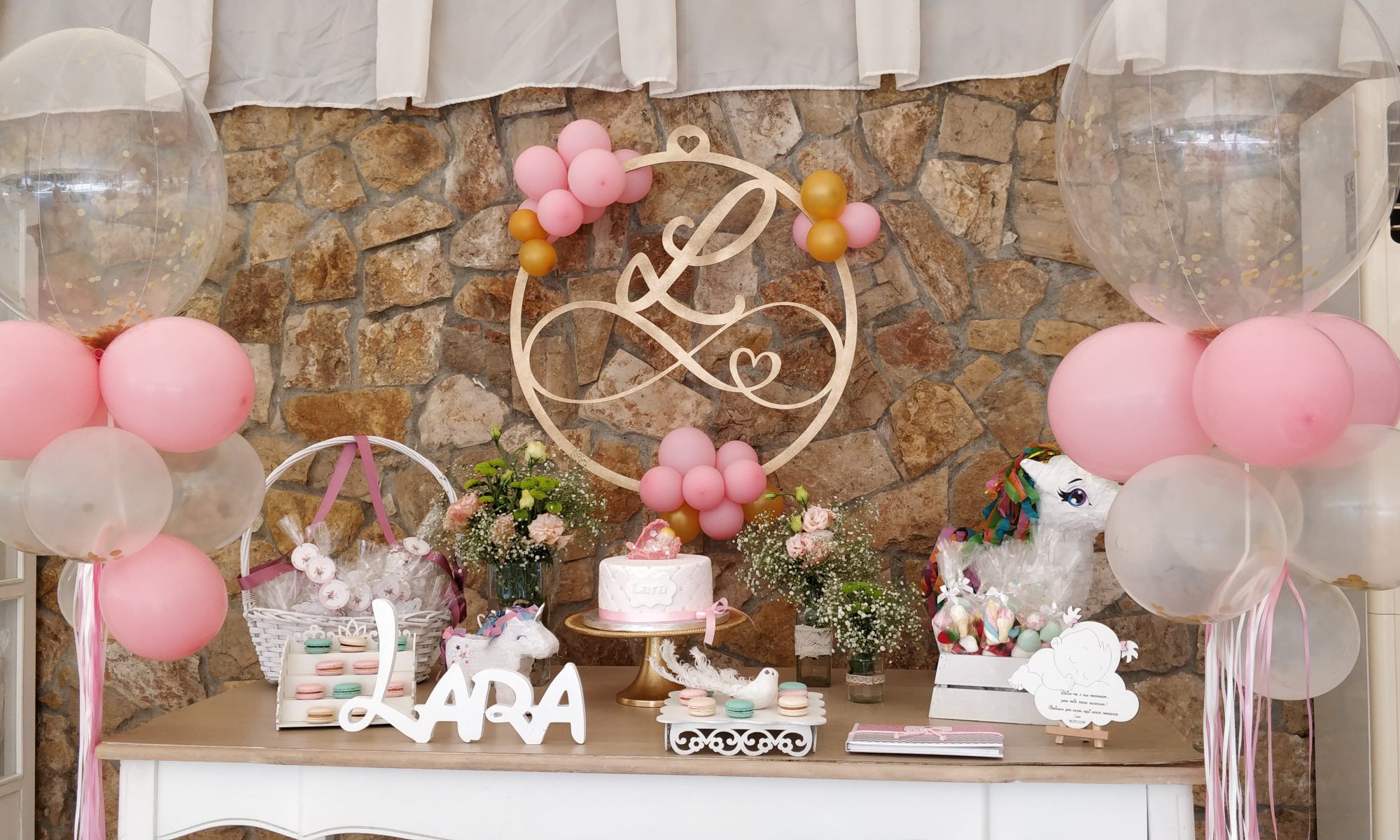 Um dia em cheio. Fizemos a decoração sweet table, arco com o nome da menina, arco com o nome dos pais e fornecemos os macarons. obrigada.