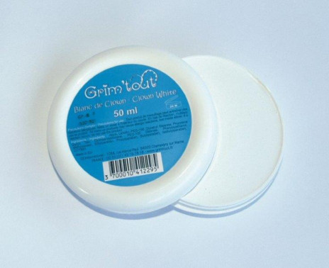 Boião de tinta profissional para pinturas faciais. Inclui um boião de tinta de 50mL de branco palhaço. Tinta antialérgica, sem parabenos, de fácil remoção e da mais alta qualidade da marca Grim'tout.