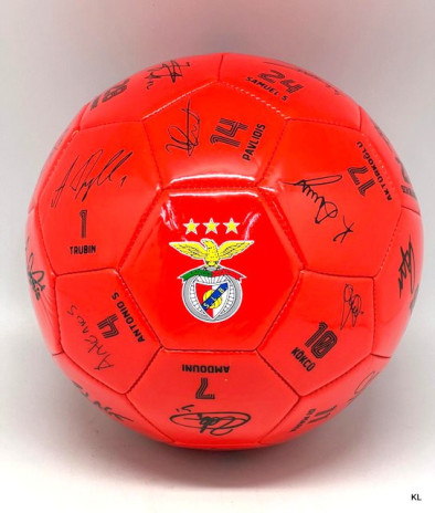Bola de futebol do Sport Lisboa e Benfica, em vermelho com as assinaturas dos jogadores da temporada 2024/2025 para te divertires a jogar.