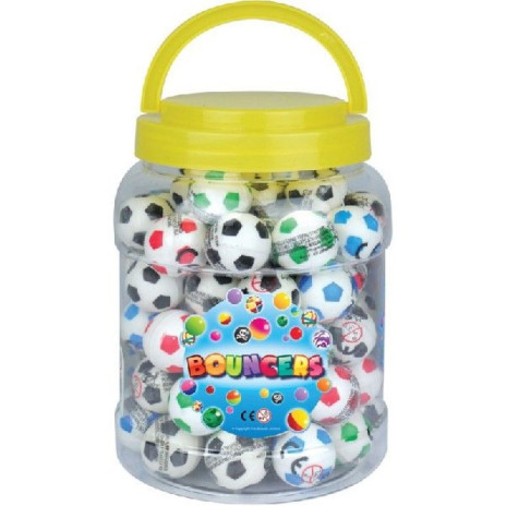 Bola saltitona com o tema de futebol com cerca de 3.3cm de diâmetro. Ideal para brinde de aniversário.