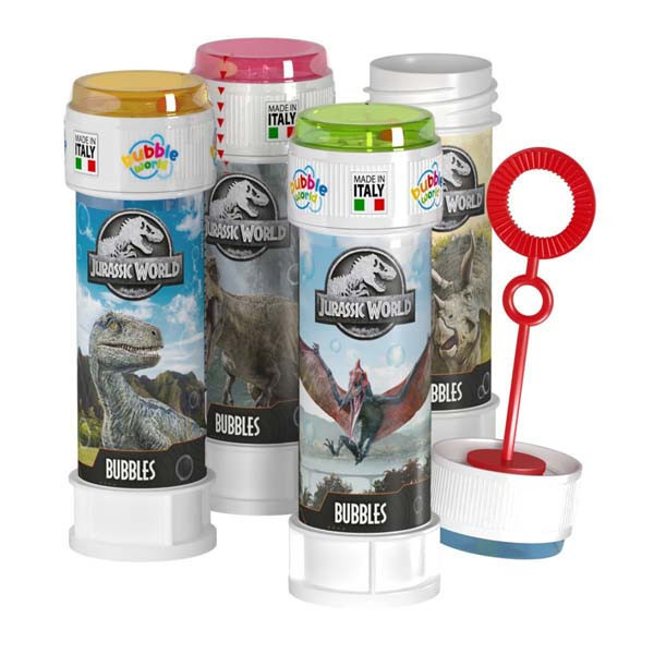 Frasquinho para fazer bolhas de sabão com dinossauros do Jurassic World. Com este frasco podes fazer vários tamanhos de bolas. Uma ótima e divertida ideia para oferecer como brinde de festa de aniversário.