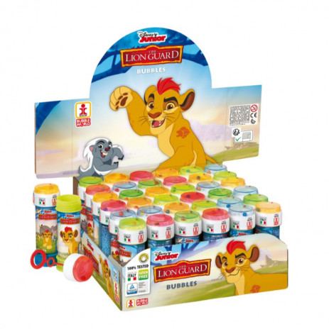 Frasquinho standard para fazer bolhas de sabão com as adoráveis personagens da série animada Guarda do Leão, os ajudantes do Kion, com vários modelos sortidos. Uma ótima e divertida ideia para oferecer como brinde de festa de aniversário.