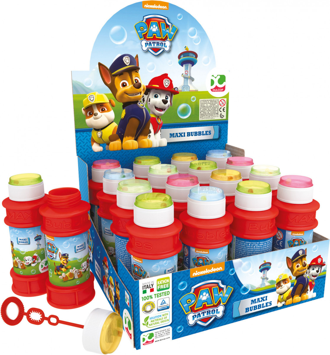 Frasco grande para fazer bolhas de sabão da Paw Patrol. Com este frasco podes fazer três tamanhos de bolas de sabão diferentes de uma só vez.