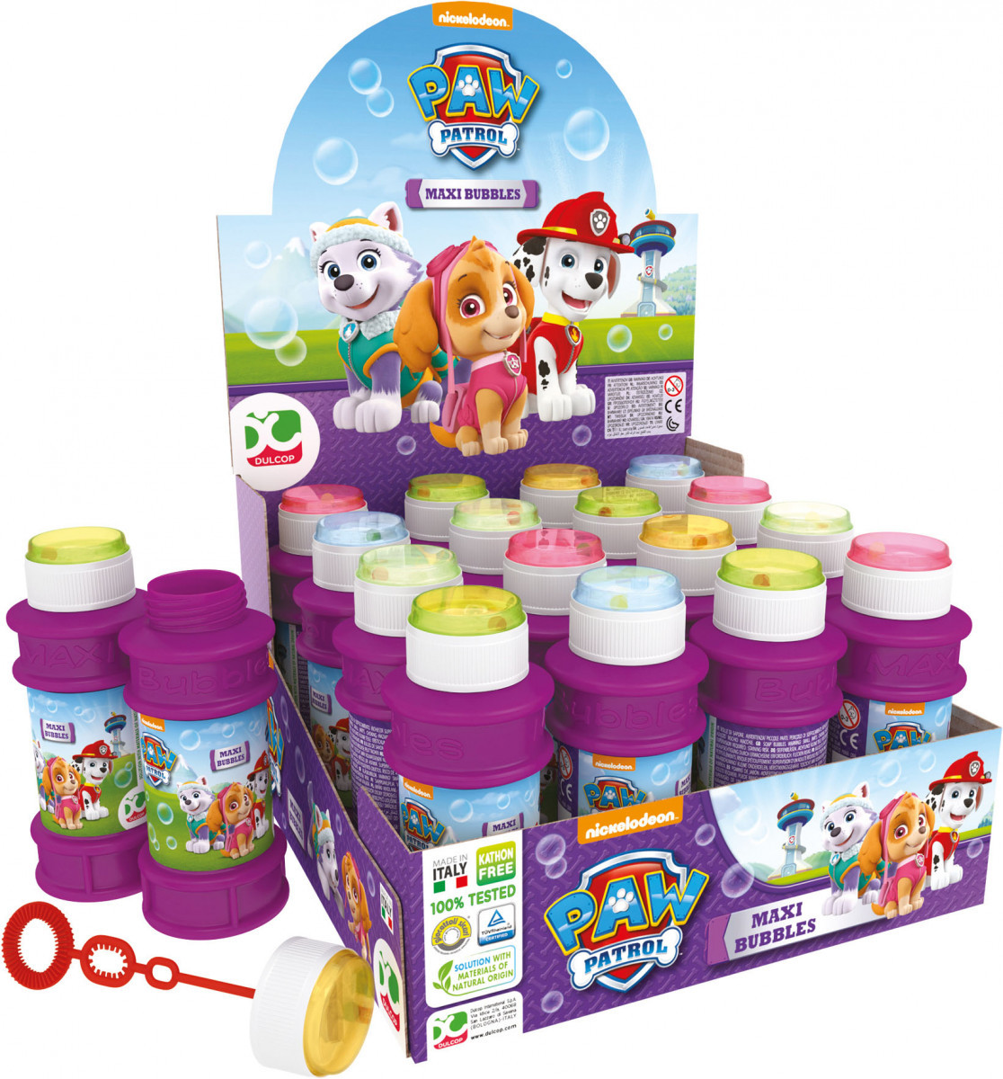 Frasco grande para fazer bolhas de sabão com a Skye da Paw Patrol. Com este frasco podes fazer três tamanhos de bolas de sabão diferentes de uma só vez.