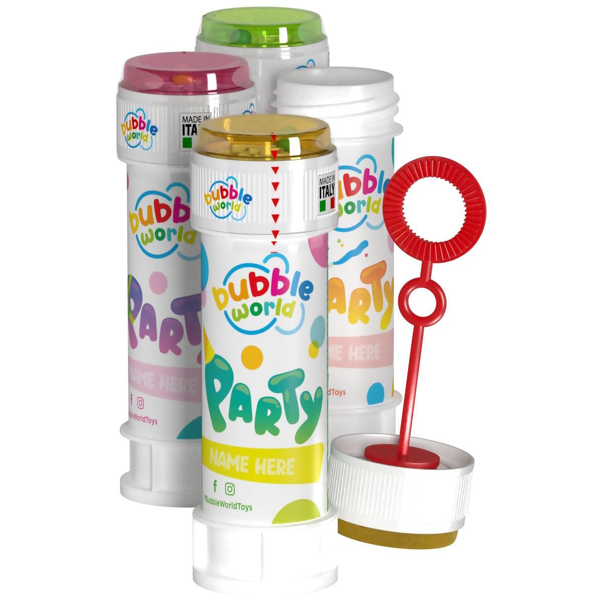 Frasquinho para fazer bolhas de sabão com o tema Party. Com este frasco podes fazer vários tamanhos de bolas de sabão diferentes de uma só vez. Uma ótima e divertida ideia para oferecer como brinde de festa de aniversário.