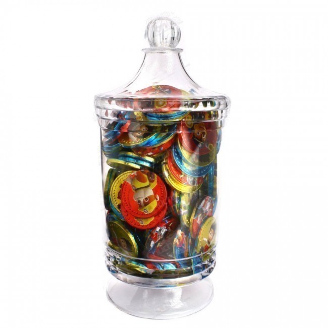 Um artigo irresistivel para colocar em qualquer festa de aniversário Paw Patrol. Uma elegante bomboneira em vidro com 175 moedas de chocolate sortidas nas cores azul, vermelho e amarelo com várias imagens do Chase, Marshall, Skye, Rocky, Rubble, Ryder e Zuma. Peso Bruto: 1700gr. Peso liquido: 1010gr. Diâmetro das moedas: 4cm.Dimensões: 26 x 11 cm.